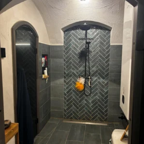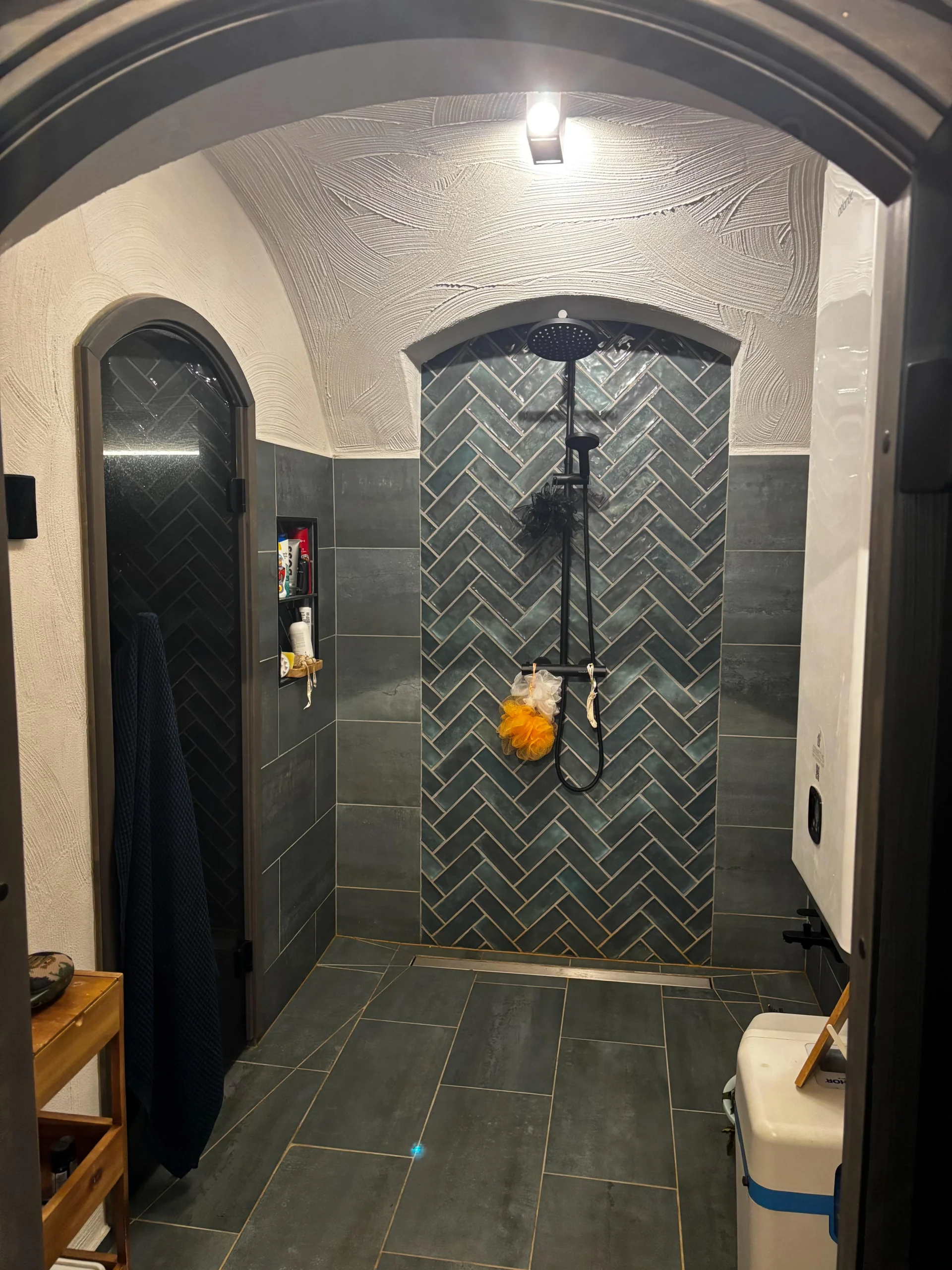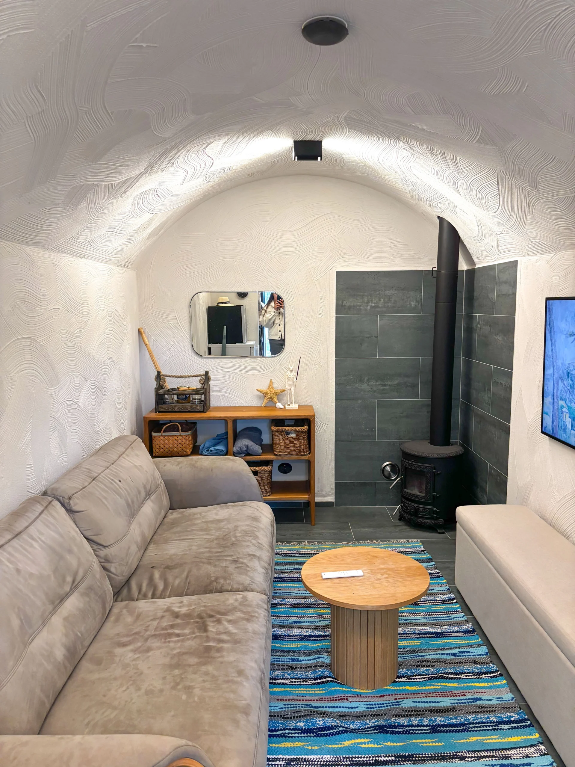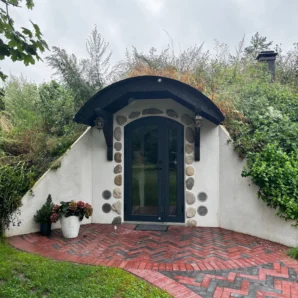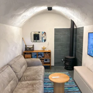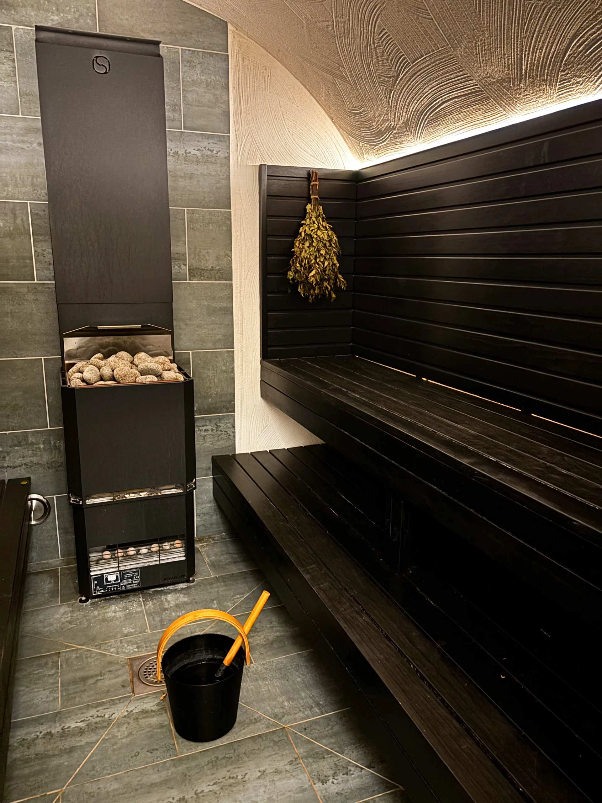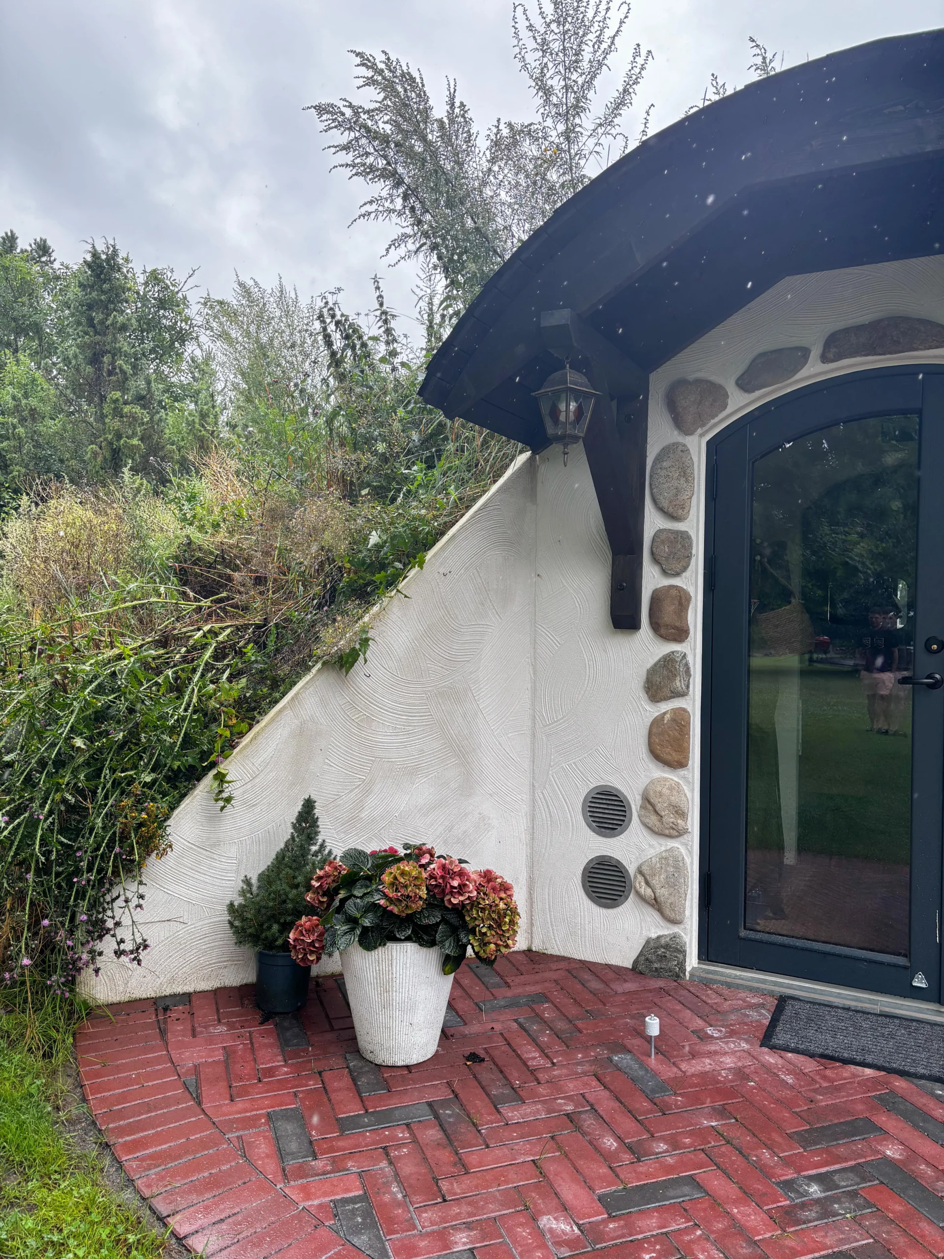I denne badstuen, bygget inn i en skråning, møtes naturlige materialer og moderne stil. Den steinrammede inngangen leder inn til en dampbadstue kledd i mørkt tre, som sammen med mykt lys skaper en beroligende kontrast til grøntområdet utenfor. Et fredelig tilfluktssted formet av jord og komfort.