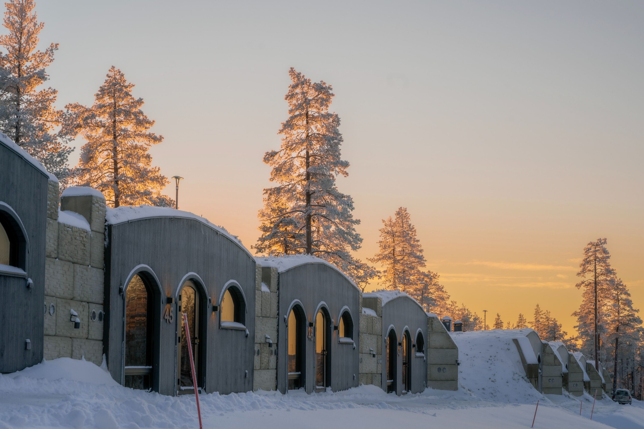 Vi bygde 80 modulære, underjordiske suiter i som naturlig glir inn i landskapet i Aavasaksa — som om de alltid har hørt hjemme der. Dekkede av jord og formet av buet betong holder suitene et naturlig stabilt inneklima gjennom hele året, med lavt energiforbruk.